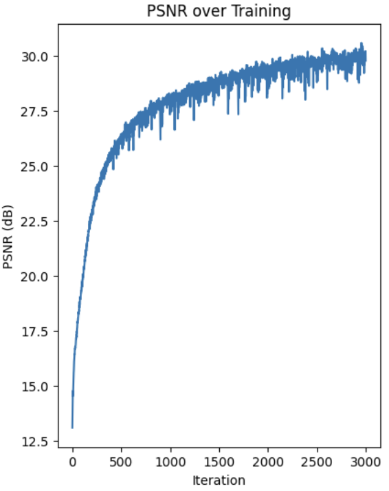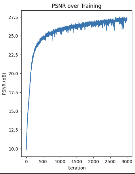 For the dataset, I created a class that creates training pairs of (pixel coordinates, colors) from an image. It randomly samples pixel positions and gets the corresponding RGB values. Both the coordinates and colors are normalized. I used the MSE loss, and reconstruct the PSNR using the MSE at each iteration. Here are the progressive results. With the last image being the final output after all the iterations. My architecture is the same as the one in the project spec. I used 3k iterations along with 10k batch size.