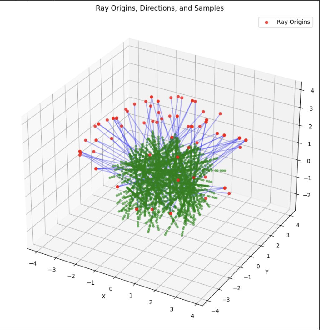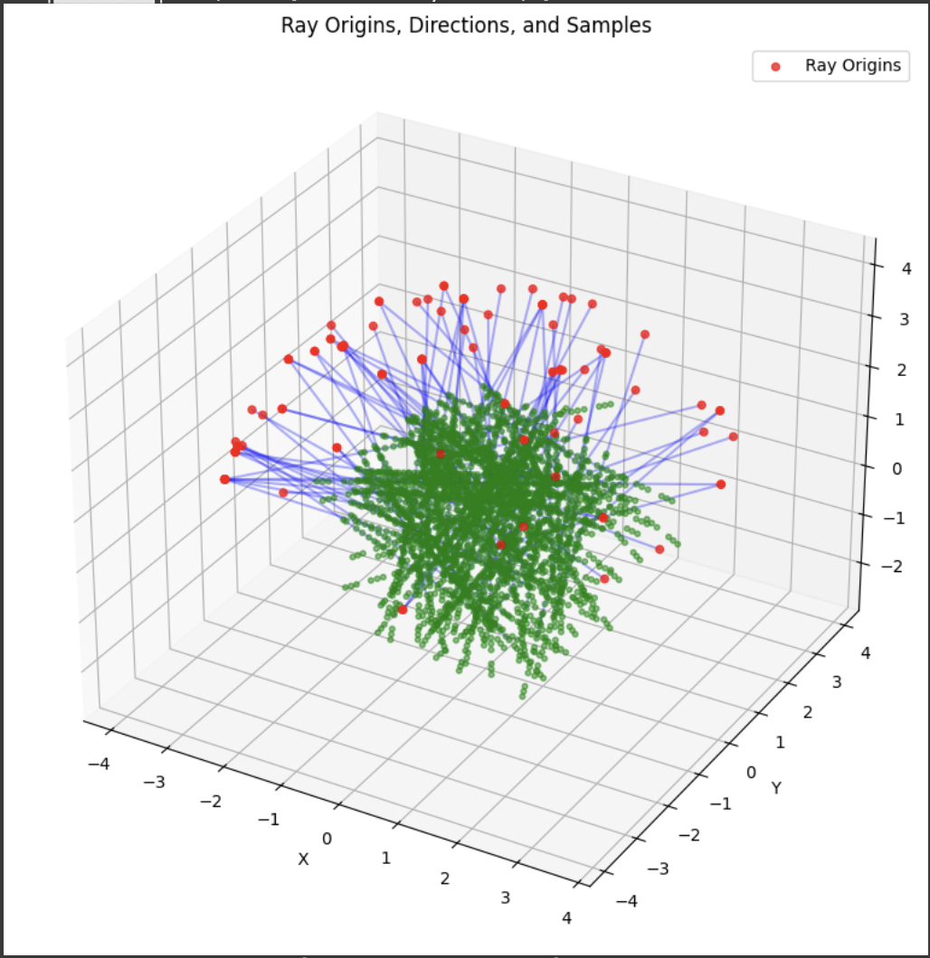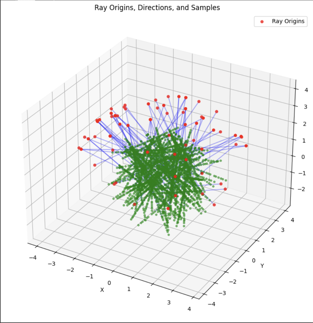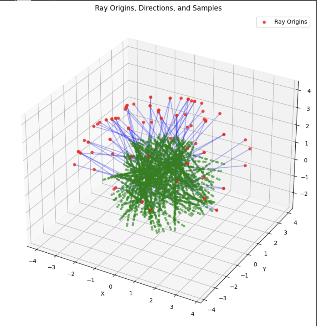 Now that the core geometry is taken care of, we are ready to sample. The RaysData class is responsible for managing the input data for the NeRF model. The sample_rays method returns the ray origins, ray directions, and the corresponding pixel values This data is crucial for training the NeRF model, as it provides the necessary information to learn the mapping between the 3D scene and the 2D images. It selects B images from the available training images, generates random 2D pixel coordinates within the dimensions of the training images, then it calls the pixel_to_ray function. I also utilized a helper function to sample points along the given rays, which just generates a set of sample points along the rays.