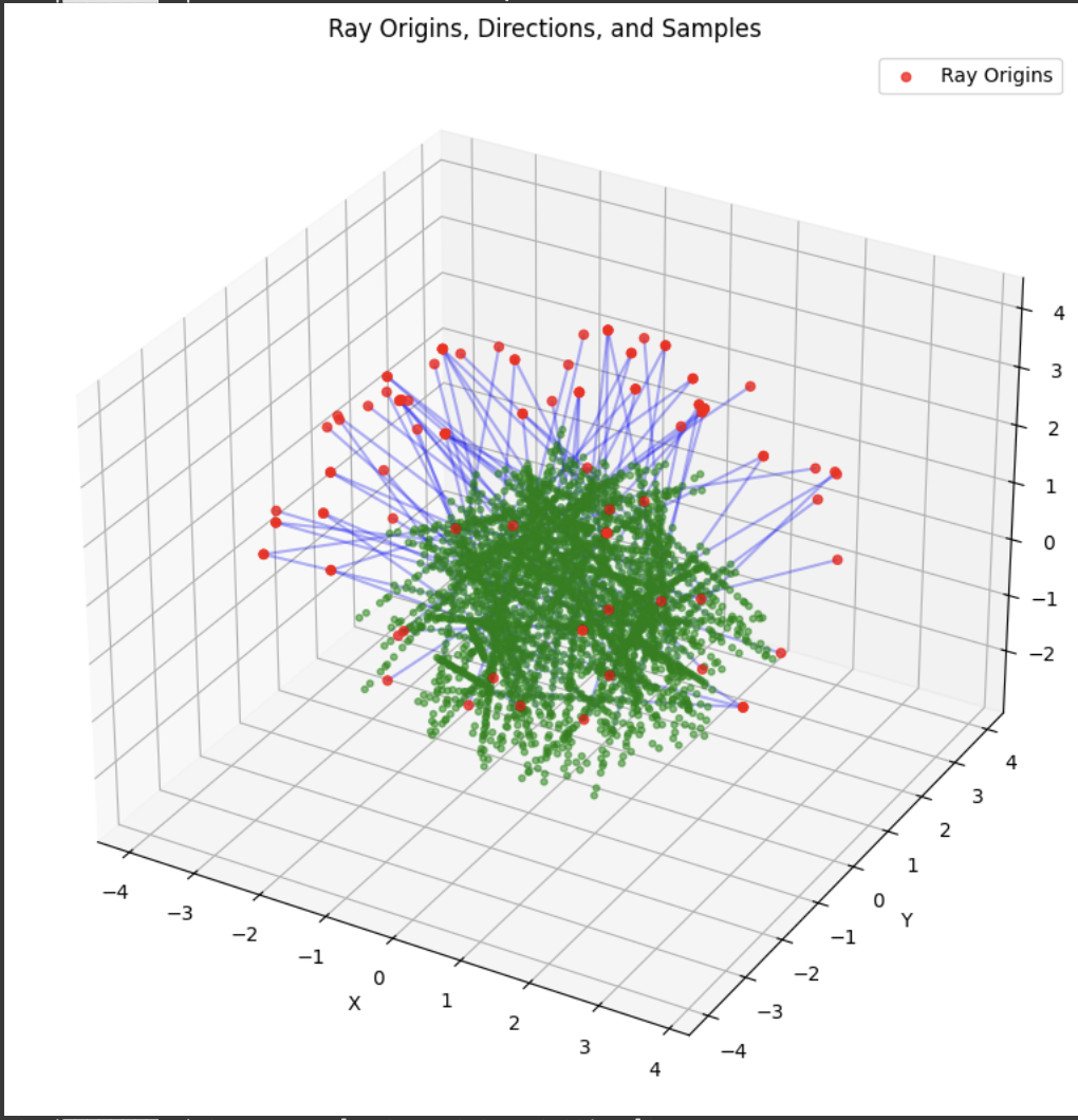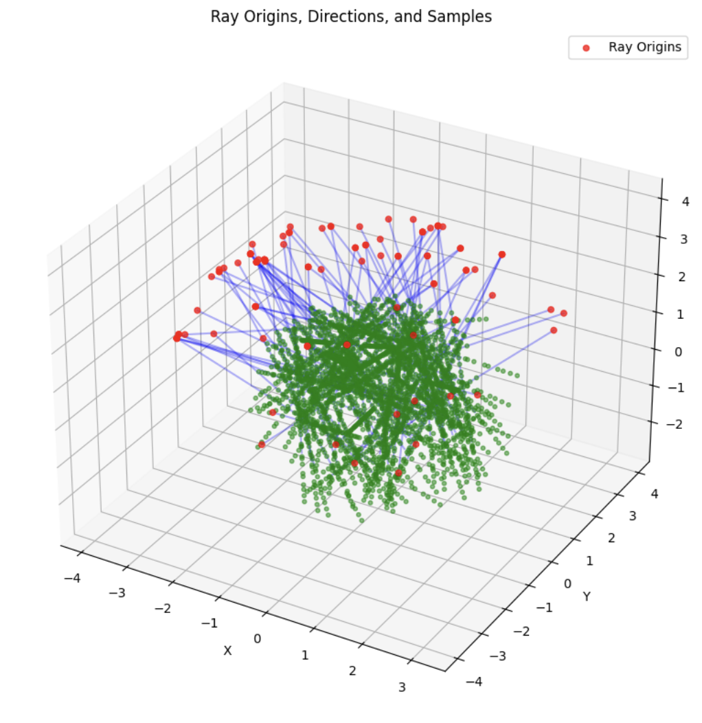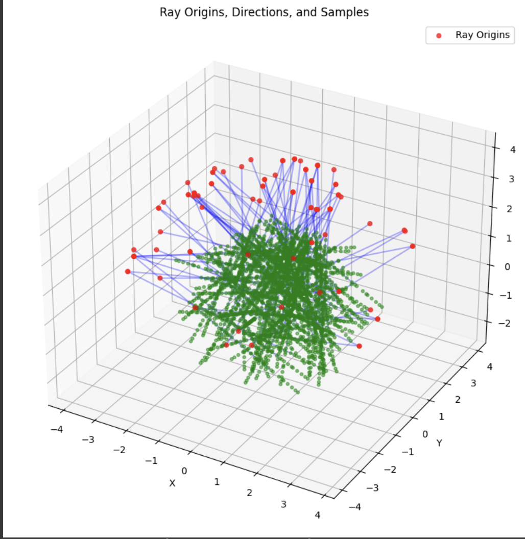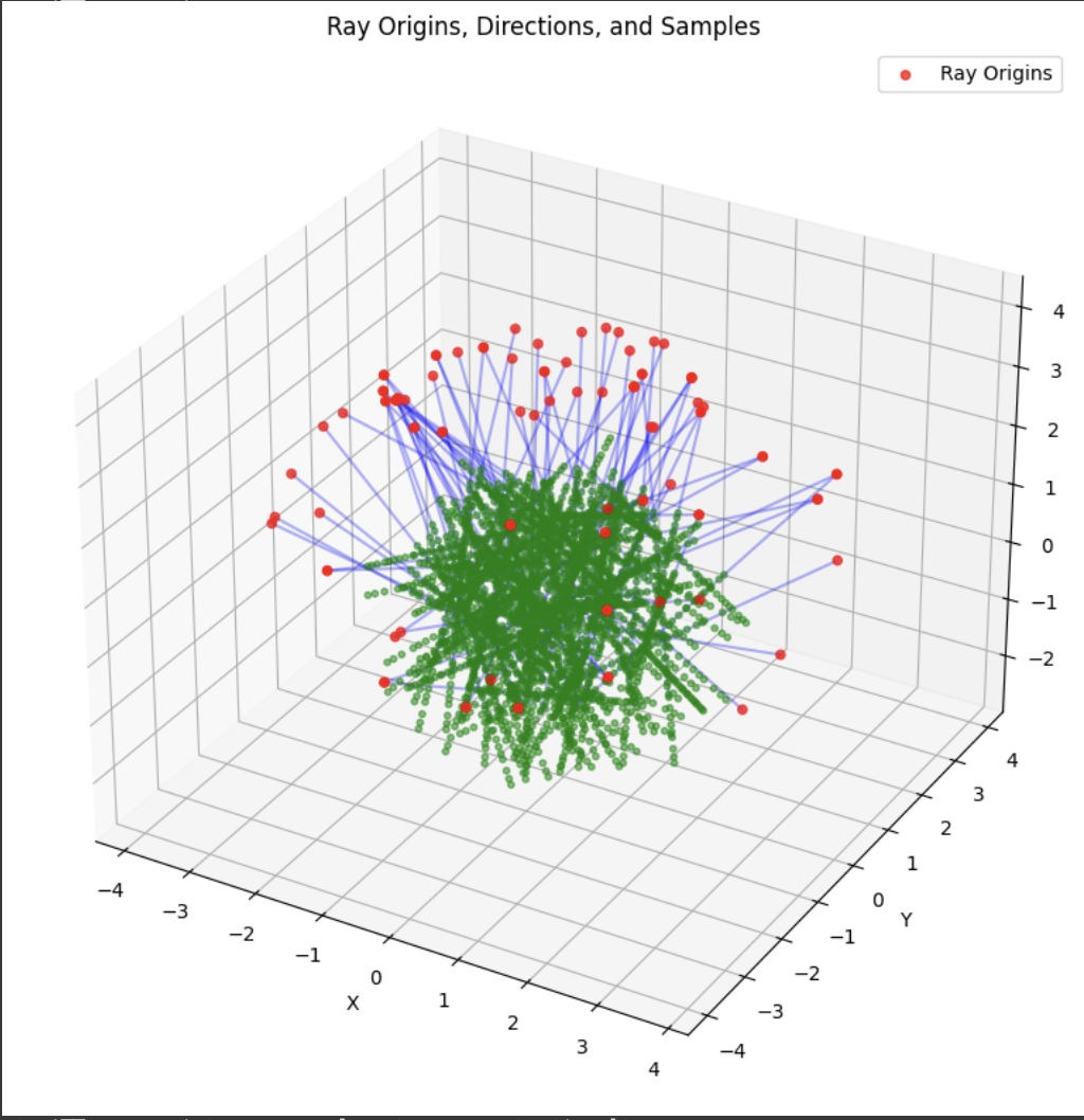 Now that the core geometry is taken care of, we are ready to sample. The RaysData class is responsible for managing the input data for the NeRF model. The sample_rays method returns the ray origins, ray directions, and the corresponding pixel values This data is crucial for training the NeRF model, as it provides the necessary information to learn the mapping between the 3D scene and the 2D images. It selects B images from the available training images, generates random 2D pixel coordinates within the dimensions of the training images, then it calls the pixel_to_ray function. I also utilized a helper function to sample points along the given rays, which just generates a set of sample points along the rays.